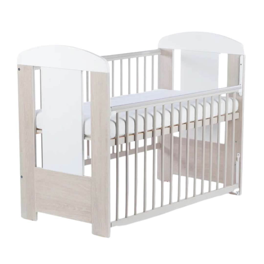 - Material y Color: Fabricada con madera de haya y acabado en roble/blanco, esta cuna utiliza barnices no tóxicos y seguros para tu bebé.