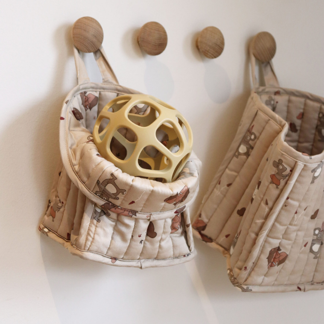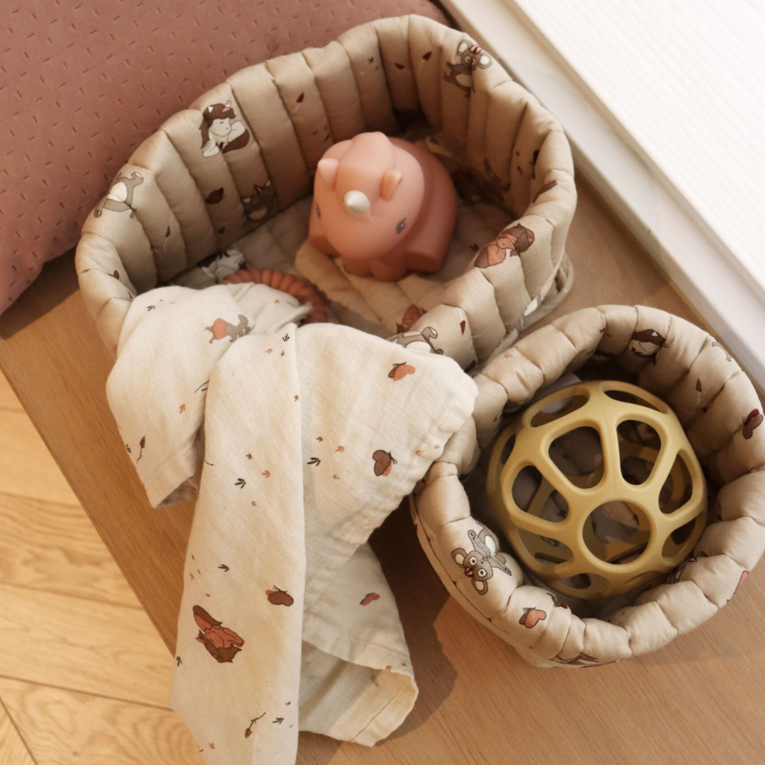 Mantén los esenciales de tu bebé siempre organizados con el set de canastos acolchados Lumi. Confeccionados en suave algodón orgánico 100%, son perfectos para guardar pañales, cremas, juguetes pequeños o accesorios, manteniendo todo al alcance de la mano. Su diseño acolchado les da una estructura firme pero delicada, ideal para el mudador, la habitación o el baño.