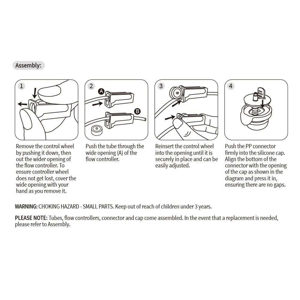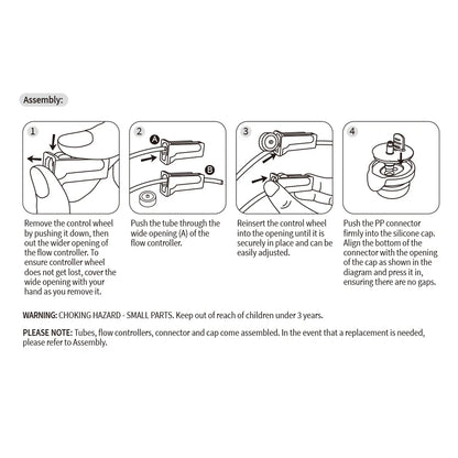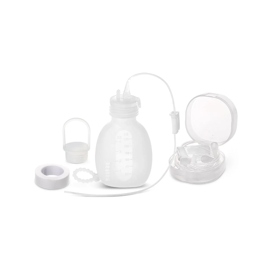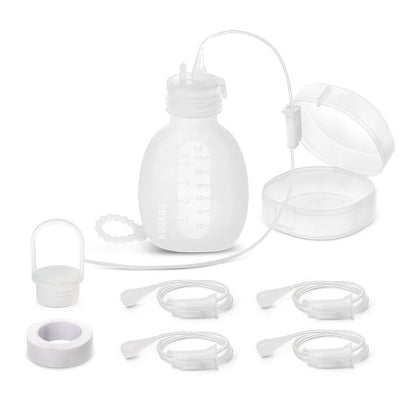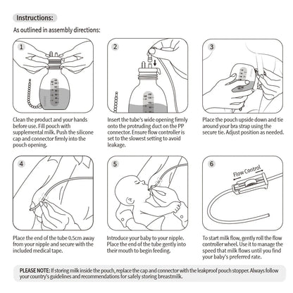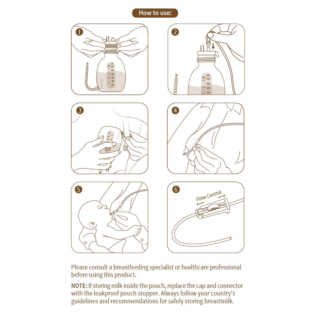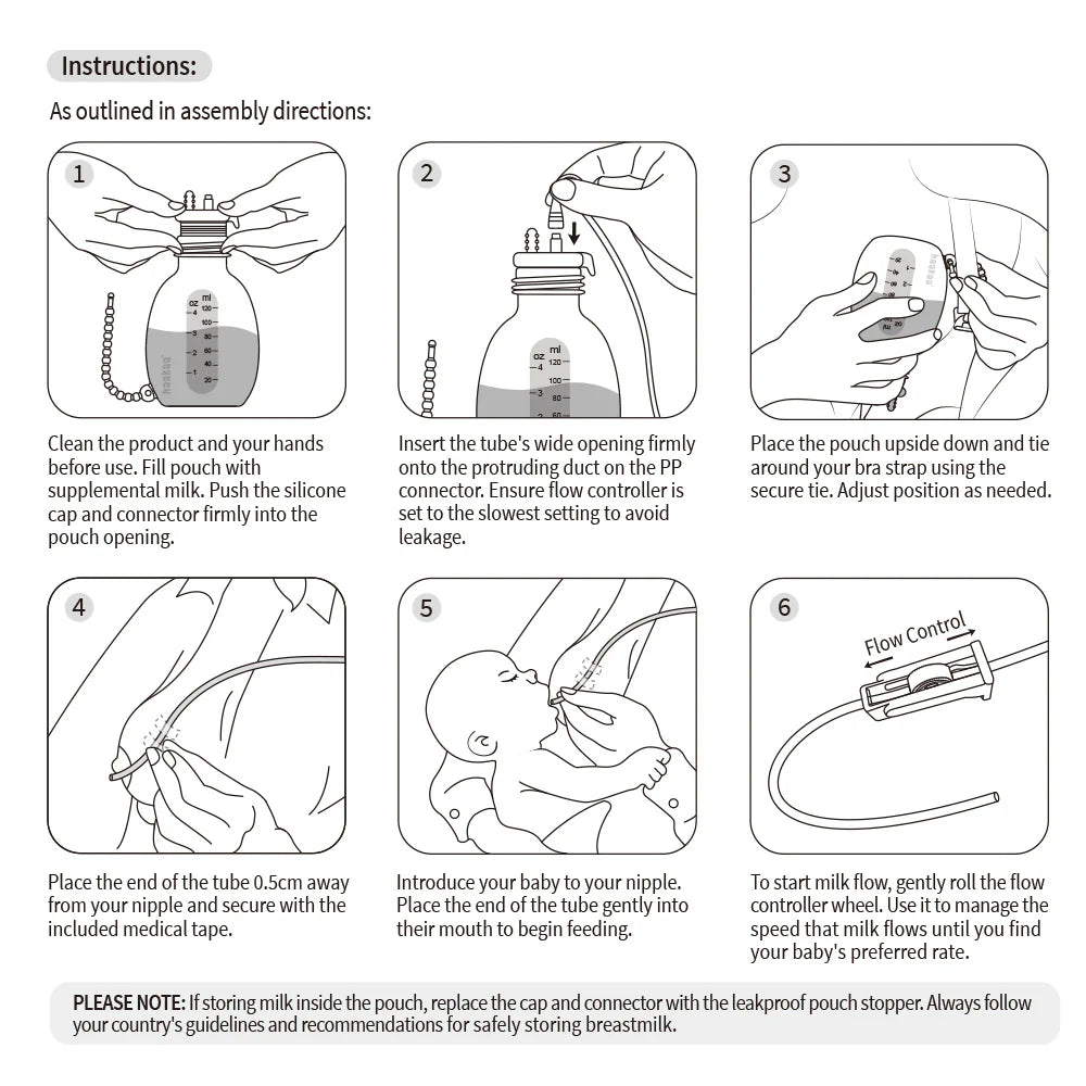 El sistema cuenta con tubos de alimentación suaves y delgados, diseñados para ser seguros y amables con la boquita de tu bebé. Su bolsa de silicona comprimible de 170 ml (5.7 fl oz) incluye un controlador de flujo que permite ajustar la velocidad de salida de la leche, facilitando una alimentación tranquila y controlada. Además, el set incluye tubos adicionales para recambios rápidos y sin complicaciones.
