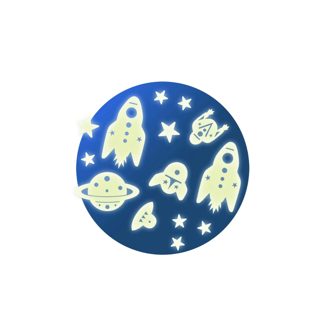 ¡Transforma cualquier habitación en un fascinante escenario galáctico con los Stickers Misión Espacial! Este set incluye 62 piezas de brillantes estrellas, planetas y naves espaciales que absorben la luz durante el día y brillan en la oscuridad, creando una atmósfera mágica y única durante la noche.