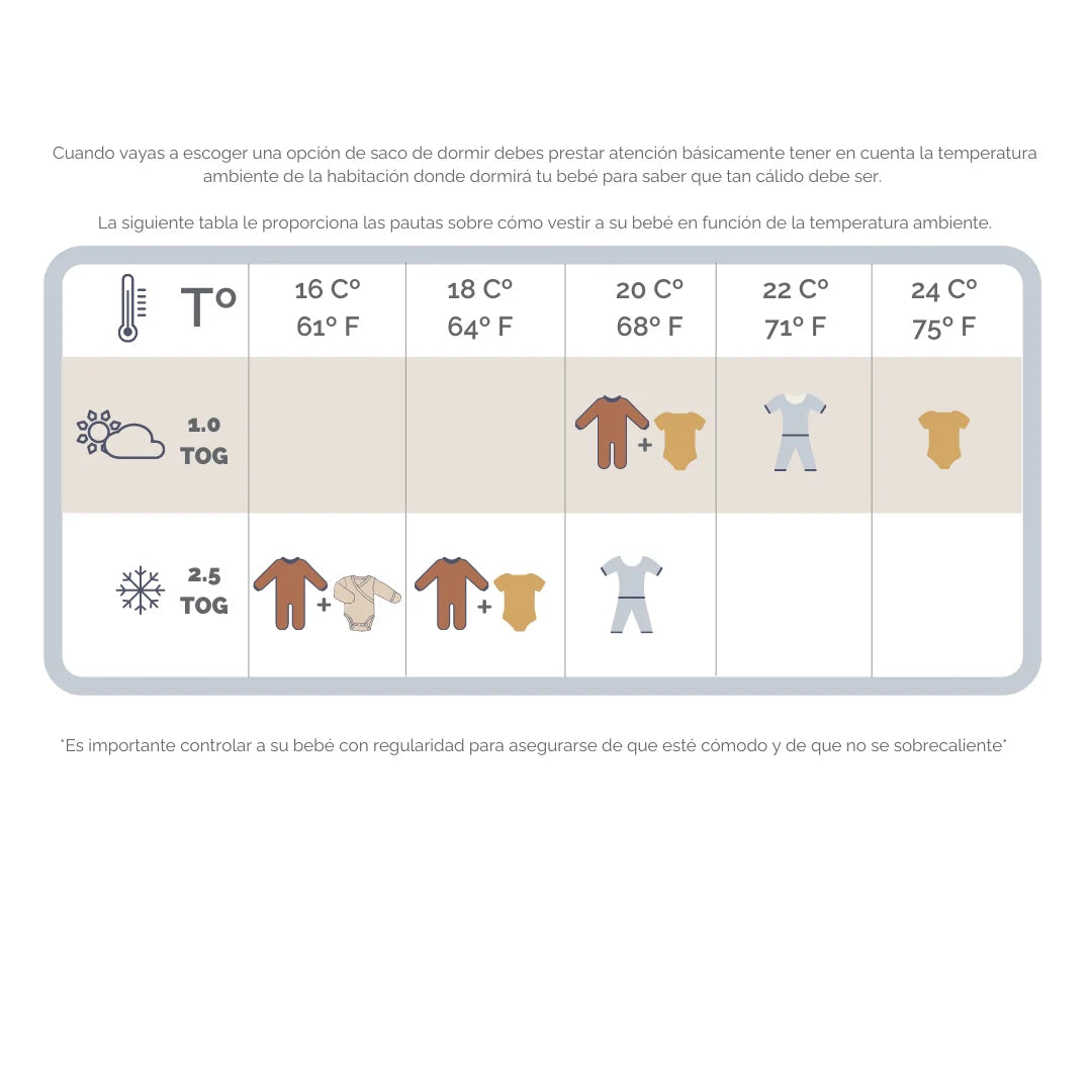 5. Mi bebé está creciendo muy rápido. ¿Puedo simplemente comprar un saco de dormir de mayor tamaño y dejar que él o ella crezca? Por muy tentador que sea comprar un tamaño más grande, desafortunadamente la respuesta es no. Es muy importante que siempre compre el saco de dormir del tamaño correcto para su bebé, en función de su peso actual. Si usa un saco que es demasiado grande para su bebé, el cierre podría quedar demasiado suelto, lo que puede ser potencialmente peligroso.
