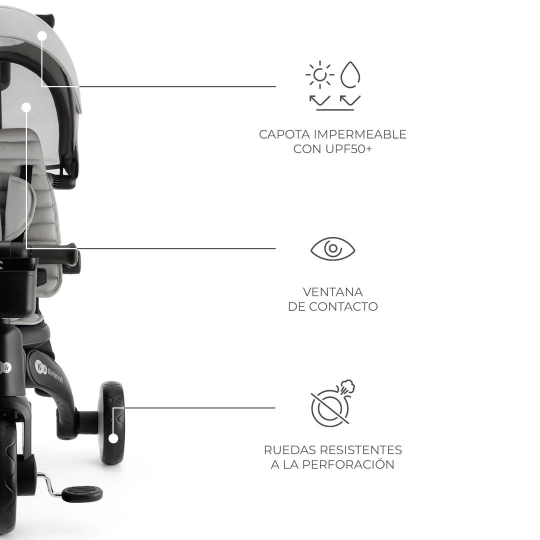 Pensado para cualquier época del año, incluye una capota impermeable con filtro solar UPF50+, que protege del sol y la llovizna. Es regulable y extensible, permitiendo una cobertura óptima en todo momento, e incorpora una ventanilla que deja ver al pequeño mientras disfruta del paseo.