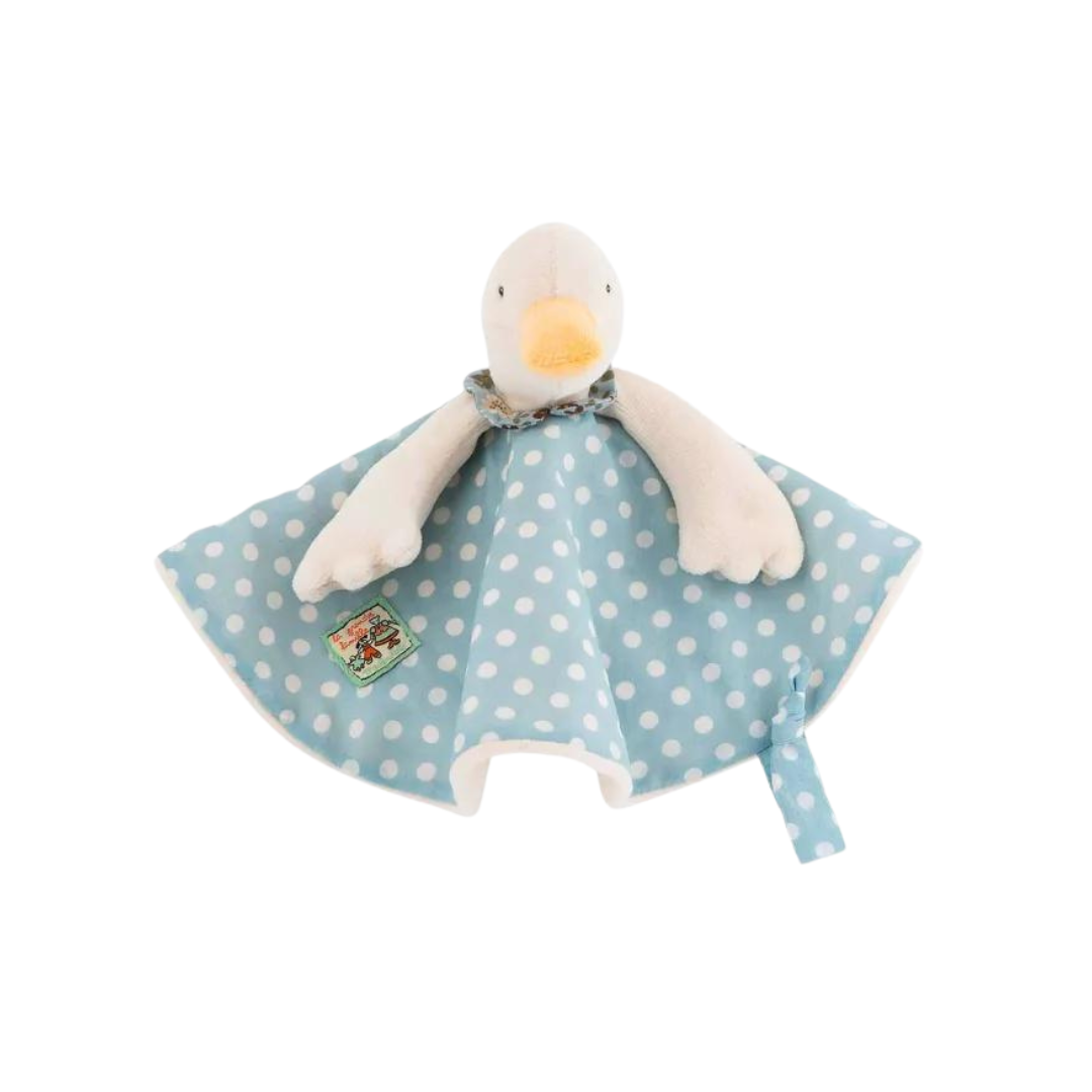 Jeanne la Pata, con su vestido de algodón con estampado de lunares y forro de terciopelo, es un tuto fácil de agarrar para las pequeñas manos de los bebés. Incluye un portachupete para sujetar el chupete. Es un excelente regalo de babyshower o de nacimiento.